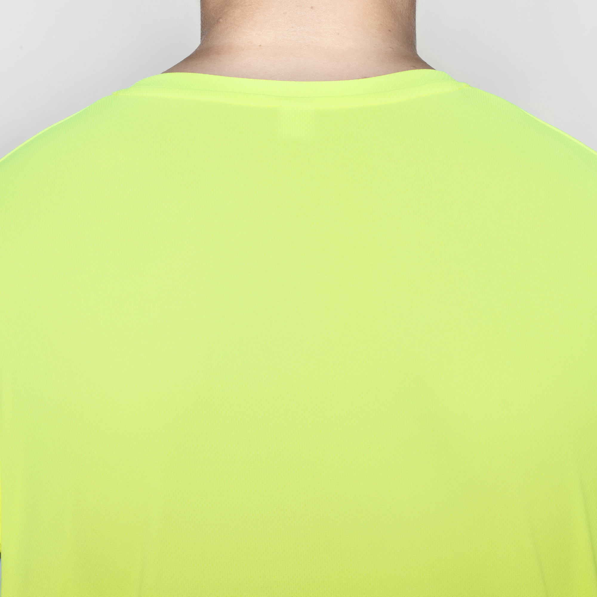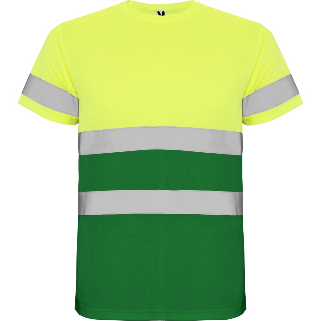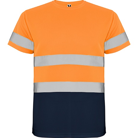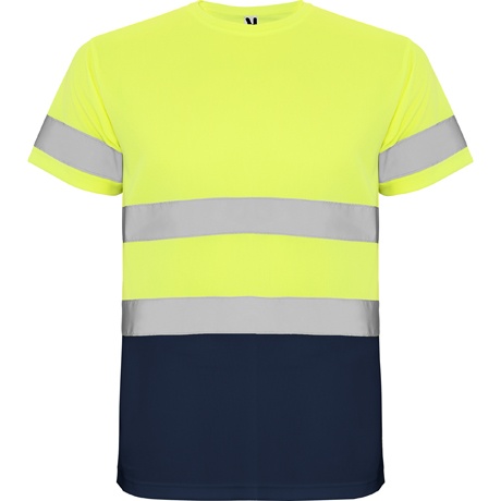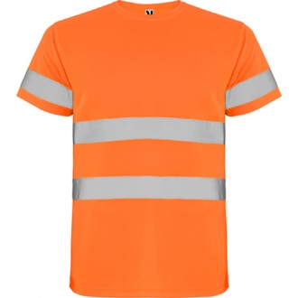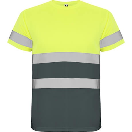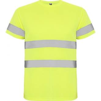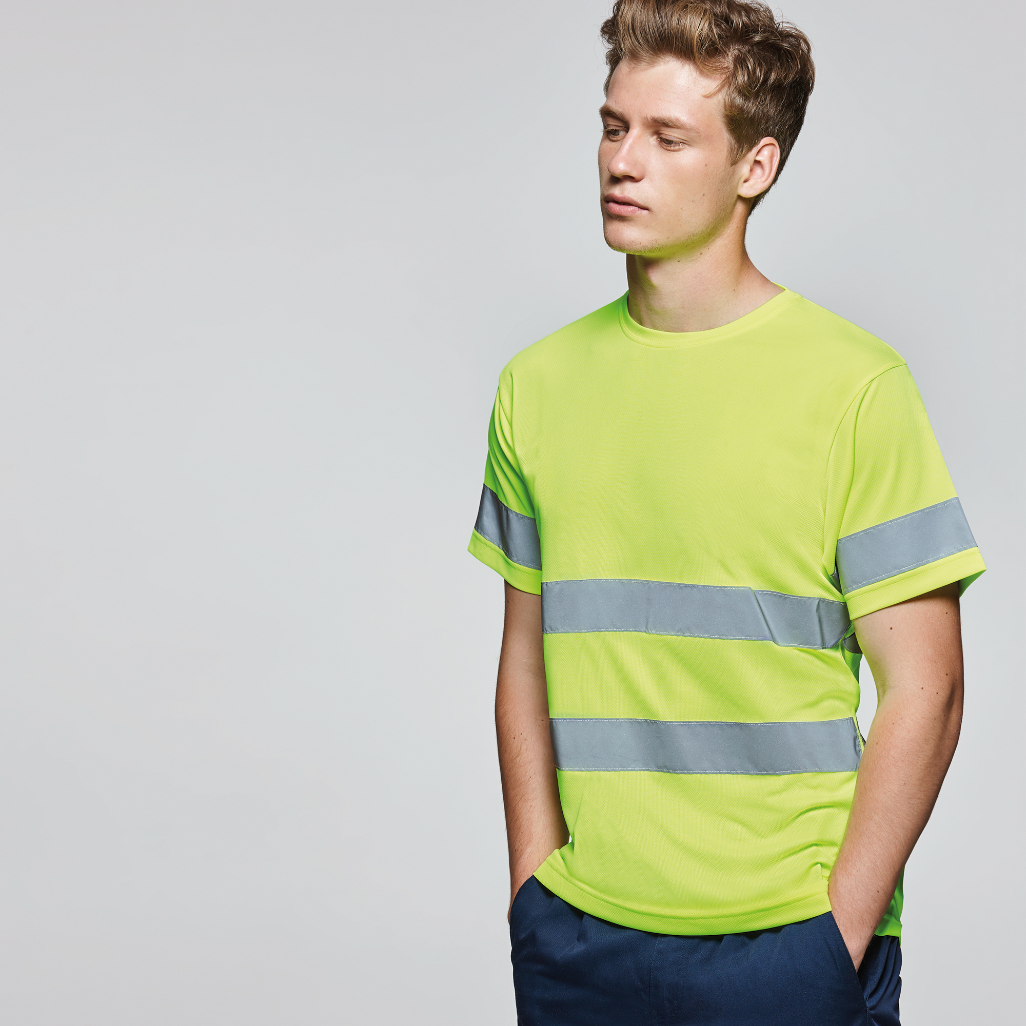 Techniczna koszulka z krótkim rękawem o wysokiej widoczności. Okrągły dekolt z tej samej tkaniny i wzmocnionymi szwami. Dwie środkowe, poziome taśmy odblaskowe i pojedyncze na rękawkach.