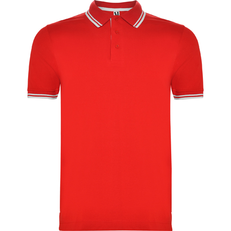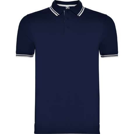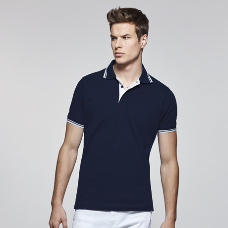 Koszulka polo z krótkim rękawem. Zapięcie na trzy guziki. Prążkowany kołnierz. Wzmocnione, kryte szwy w kołnierzu i na ramionach.