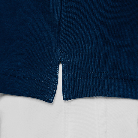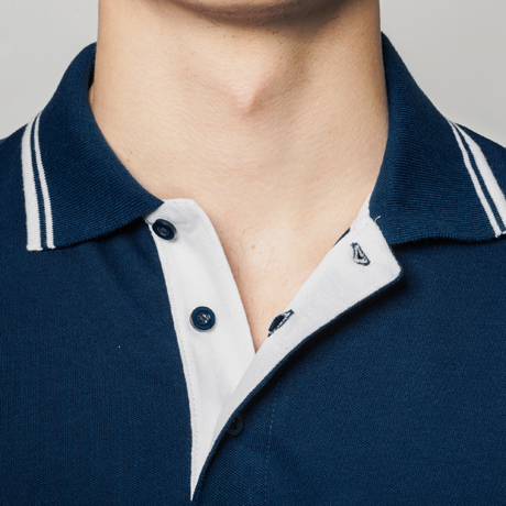 Koszulka polo z kontrastowym wykończeniem kołnierzyka. Zapięcie z trzema guzikami. Prążkowany kołnierzyk i mankiety. Wzmocnione, kryte szwy przy kołnierzyku. Wnętrze plisy przy zapięciu dopasowane kolorystycznie do wykończenia kołnierzyka, mankietów i rozcięć bocznych u dołu.
